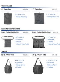 • 13 Qt. Waterproof Trash Can in a 4 Pocket Nylon Tote, and includes 4 – 5” Swivel Casters.