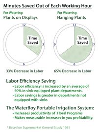 Choosing the Right WaterBoy Floral Plant Care Stations Increases Overall Profitability in the following ways. Supermarket Study shows: Reduces Labor up to 66% over hand watering with a ROI in 3-4 months. Runs on Free Gravitational Energy available at Sink, has Low Maintenance, Maximizes Safety, Cuts Shrink, Reduces Work Related Injury, Improves worker Efficiency and Productivity and allows Expansion of Floral Department throughout the store including Outdoor Sales.